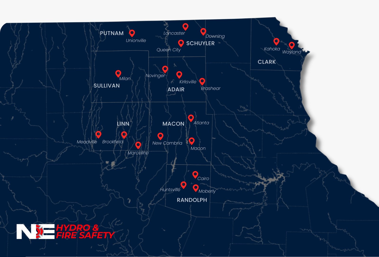 At Northeast Hydro & Fire Safety, we provide certified fire protection services to businesses across Northeast Missouri, ensuring compliance, safety, and emergency preparedness. Our team is based in Kirksville, MO, allowing us to respond quickly and efficiently to fire safety needs in both rural and urban areas.